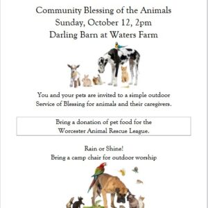 The second joint worship service for the churches of Millbury and Sutton will be a Community Blessing of the Animals. It will be held Sunday, October 12, 2025 at 2:oo PM, at the Darling Barn at Waters Farm, 53 Waters Road, Sutton, MA The event will be held rain or shine at this historic farm. […]